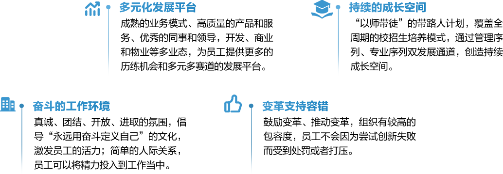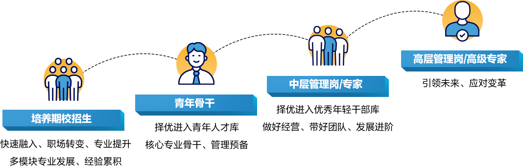 从校园招聘、新人入职到在岗培养,再延伸至未来持续发展,通过全生命周期管理模式开展校招生培养,借助“未来之星”训练营、三年培养计划,助力快速成长为独当一面的专业骨干;三年后评估优秀者逐步纳入“青年人才库”、“优秀年轻干部库”,以青蓝计划、凤凰计划等一系列独具个性化的培养举措,源源不断向重要岗位输送绩优高潜人才。